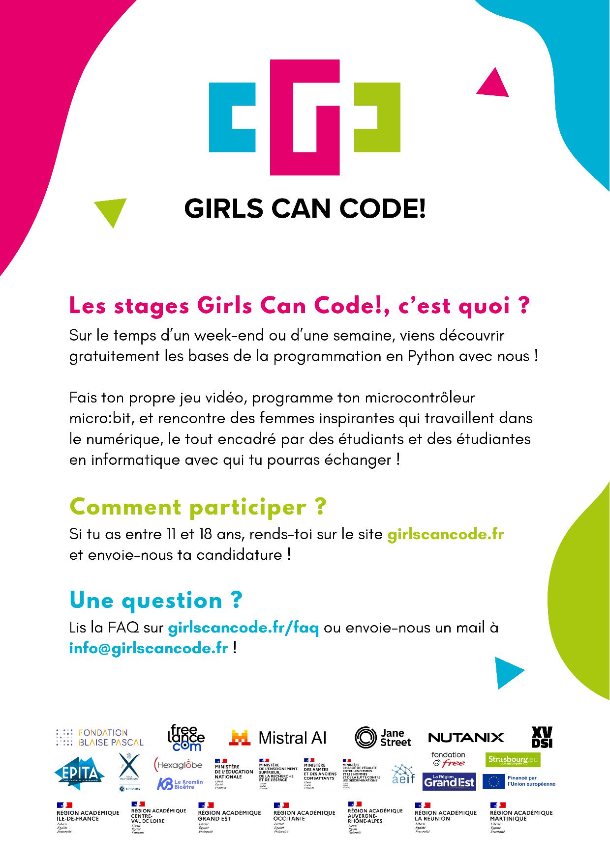 Pouvez-vous relayer à vos équipes, aux élèves et aux familles, cette possibilité de stage d'initiation à l'informatique gratuit pour les collégiennes et les lycéennes.